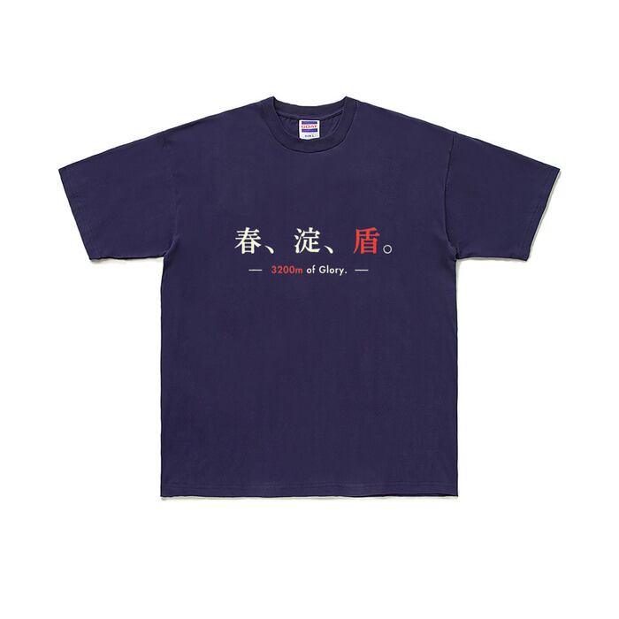 濃紺のネイビーボディに、潔く配置された「春、淀、盾。」のフレーズ。
